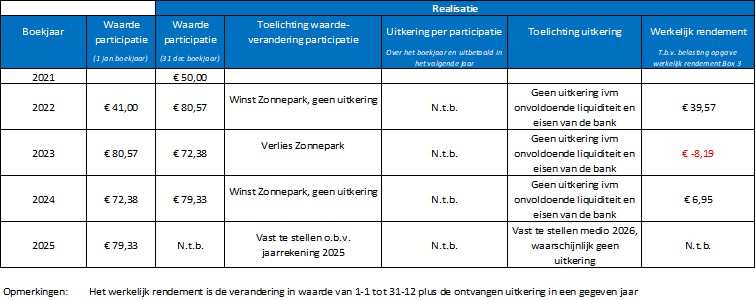 De boekwaarde is niet hetzelfde als de marktwaarde van de Zonaandelen, de waarde bij verkoop of overname van Zonaandelen. De marktwaarde wordt bepaald door vraag en aanbod en kun je inschatten op basis van de nog te verwachte kasstromen uit Zonnepark de Grift (voor meer informatie zie Informatiebrochure Zonnepark de Grift). Energiecoöperatie WPN doet geen uitspraken over de marktwaarde van de Zonaandelen.